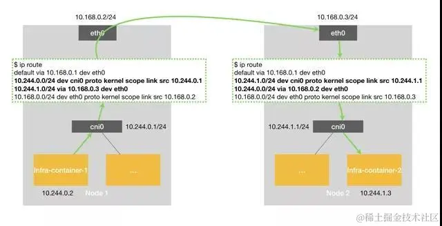 表示前往目标网段 10.244.1.0/24 的 IP 包,需要经过本机 eth0 出去发往的下一跳ip地址为10.168.0.3(node2)。然后到达 10.168.0.3 以后再通过路由表转发 cni 网桥,进而进入到 container2。