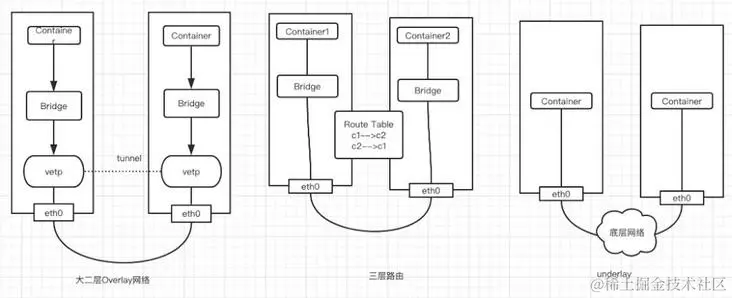 其中网关的 IP 地址不通场景有不同的意思,如果宿主机是二层可达那么就是目的容器所在的宿主机的 IP 地址,如果是三层不同局域网那么就是本机宿主机的网关IP(交换机或者路由器地址)。