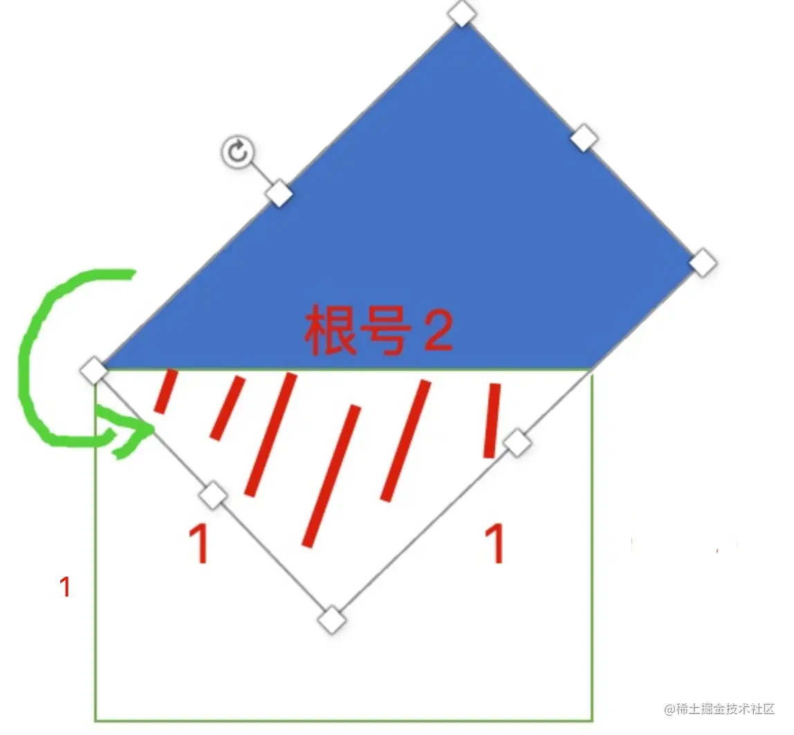 只需要两个同样位置的矩形,然后旋转上边的矩形即可。旋转过来的三角形的长边就是原来矩形的长,三角形边长比是11 比根号 2。所以原有矩形的长宽比应该为根号 21。即,width = 1.41 * height