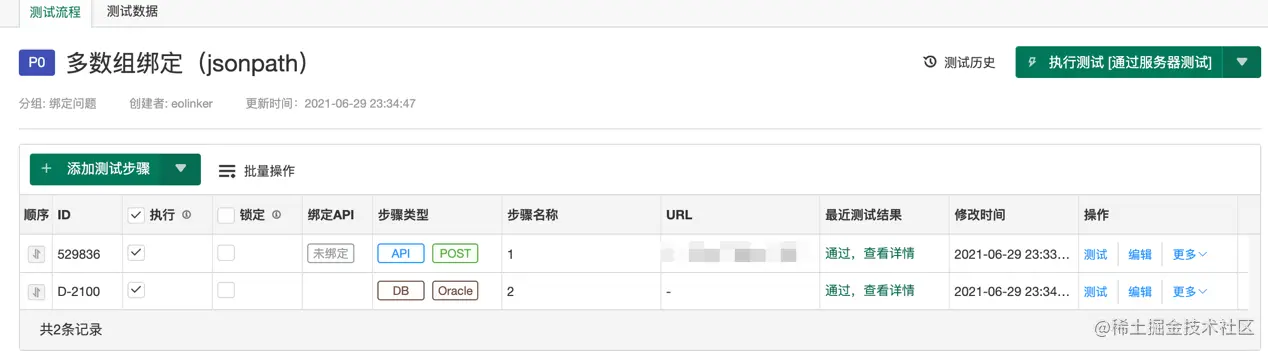 在第一个接口的“提取返回结果”模块中,选择jsonpath,遍历出数组中对应字段的集合,然后在第二个数据库插入步骤中,绑定这些数组,对应oracle的多值查询