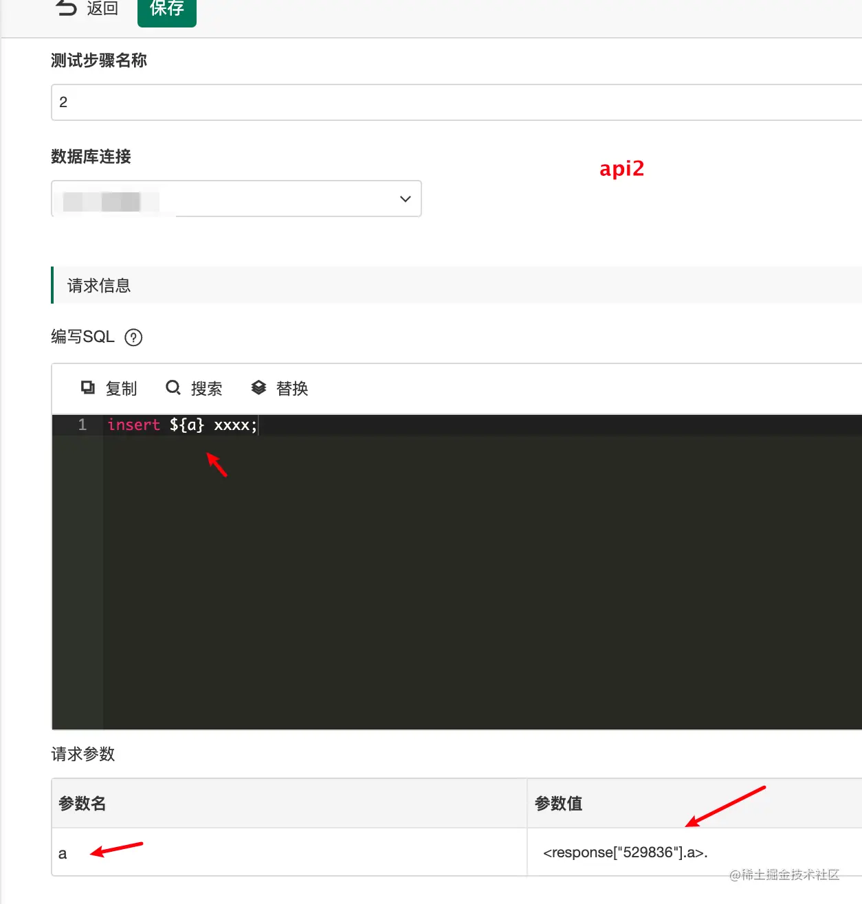 1、定义两个api步骤,第一个api步骤返回的内容,到第二个数据库步骤中入库