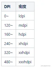 项目的资源目录下,一般都有drawable-mdpi、drawable-hdpi、drawable-xhdpi、drawable-xxhdpi、drawable-xxxhdpi目录,它们是用来匹配不同显示密度的设备的,对应表格如下。