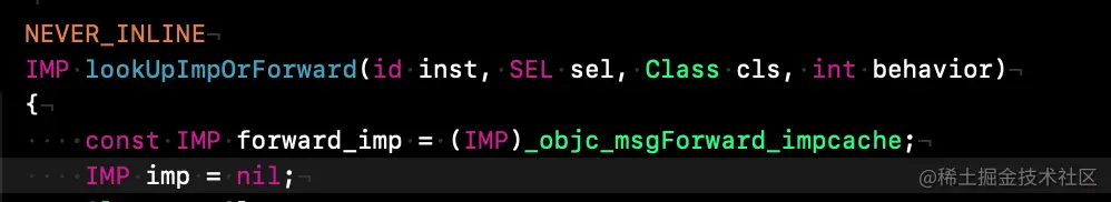我们在前面 objc_msgSend 消息转发流程探究二 中最后讲到,当在缓存跟方法列表中都找不到对应的 imp 的时候,会把 imp 赋值为 forward_imp 并返回出去。