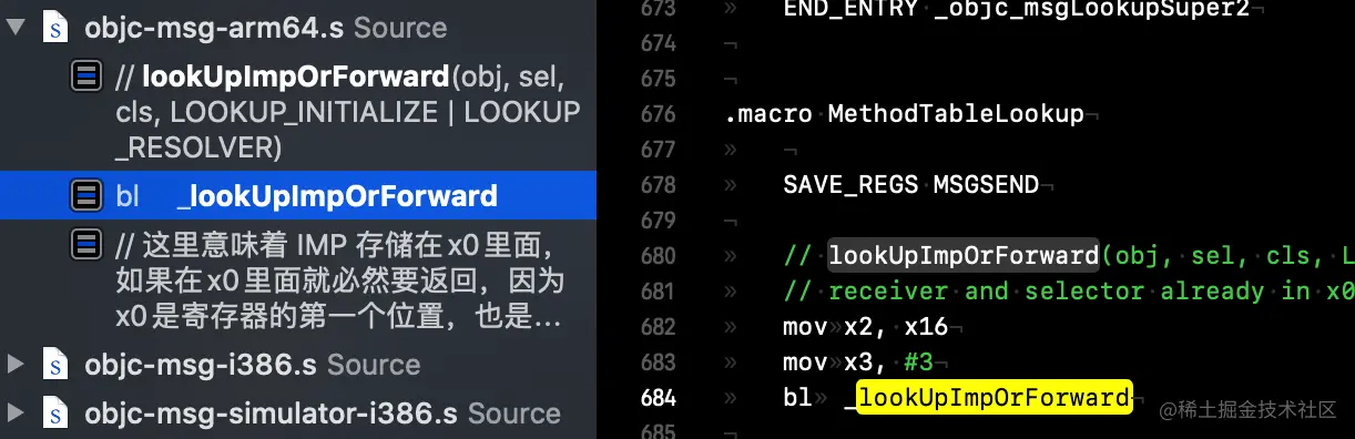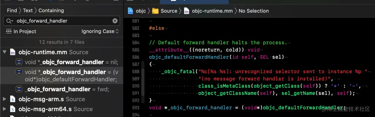 这里我们全局搜索 __objc_msgForward_impcache 会看到汇编代码的执行,b __objc_msgForward。