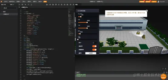 initThingJsTip("左侧面板可对灯光参数进行调整。按住 shift 键,聚光灯可追踪鼠标位置");