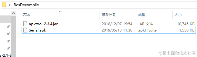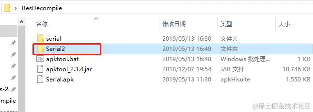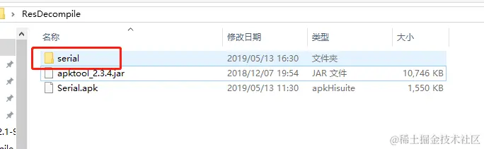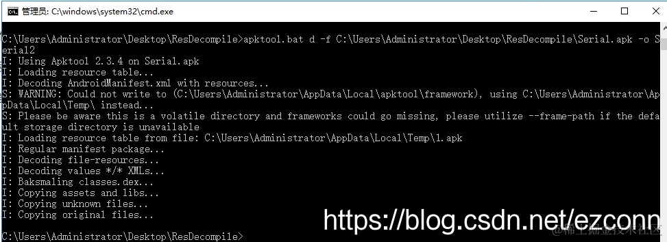 java -jar apktool_2.3.4.jar d -f C:\Users\Administrator\Desktop\ResDecompile\Serial.apk -o serial