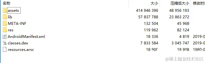 2.2,把apk文件的后缀改成.zip;用解压缩工具打开apk变更后的.zip文件如下图
