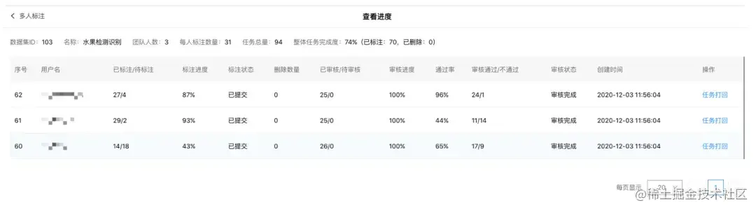 管理员可以看到标注任务和审核任务的进展,以及所有的标注详情。在需要审核的情况下,如果某个标注员的标注结果审核通过率较低,可以进行打回与重新标注,审核员与管理员也需要重新审核与验收。在验收完成之后,标注数据会保存到目标数据集中,标志着多人标注工作完成。