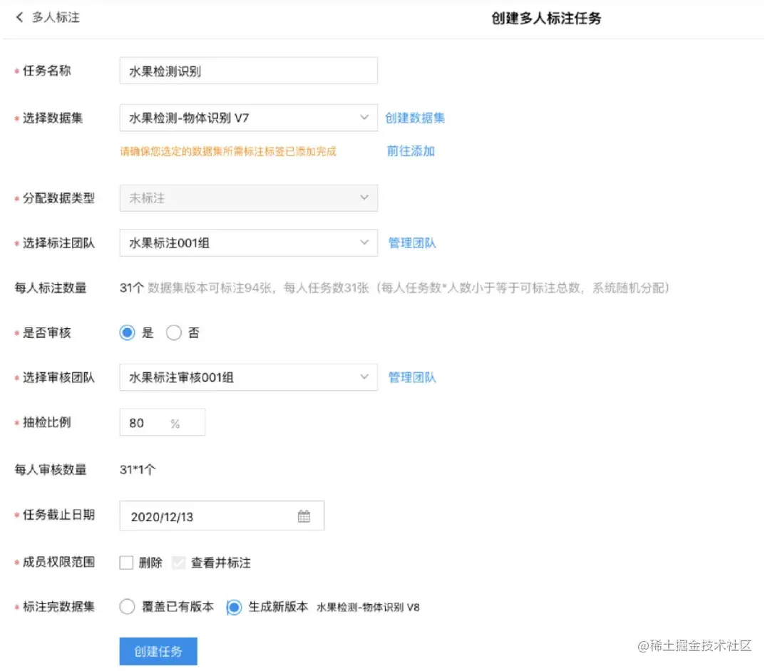 团队创建好后,就可以对已有数据集的未标注图片发起多人标注任务了。如下图:
