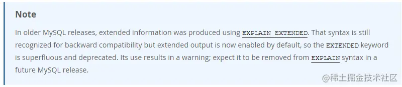 注意:explain 后面跟的关键字 EXTENDED(扩展信息) 在MySQL5.7及之后的版本中废弃了,但是该语法仍被识别为向后兼容,所以在5.7版本及后续版本中,可以不用在 explain 后面添加 EXTENDED 了;