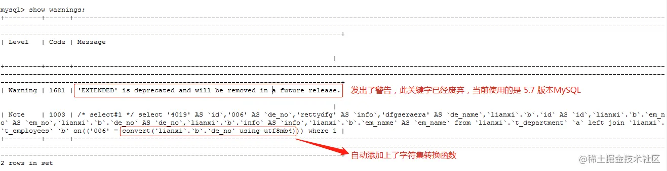 使用这个工具可以将执行的SQL语句的一些扩展信息展示出来,这些扩展信息就包括:MySQL优化时可能会添加上字符集转换函数,使得字符集不匹配的SQL可以正确执行下去;