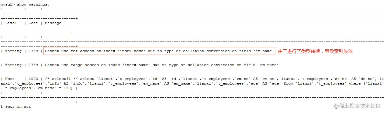 上面的SQL中 em_name 为索引字段,字段类型是 varchar,为其赋 int 类型的值时,会发现索引失效,这里也可以通过 explain extended + show warnings 查看,会发现如下图所示内容: