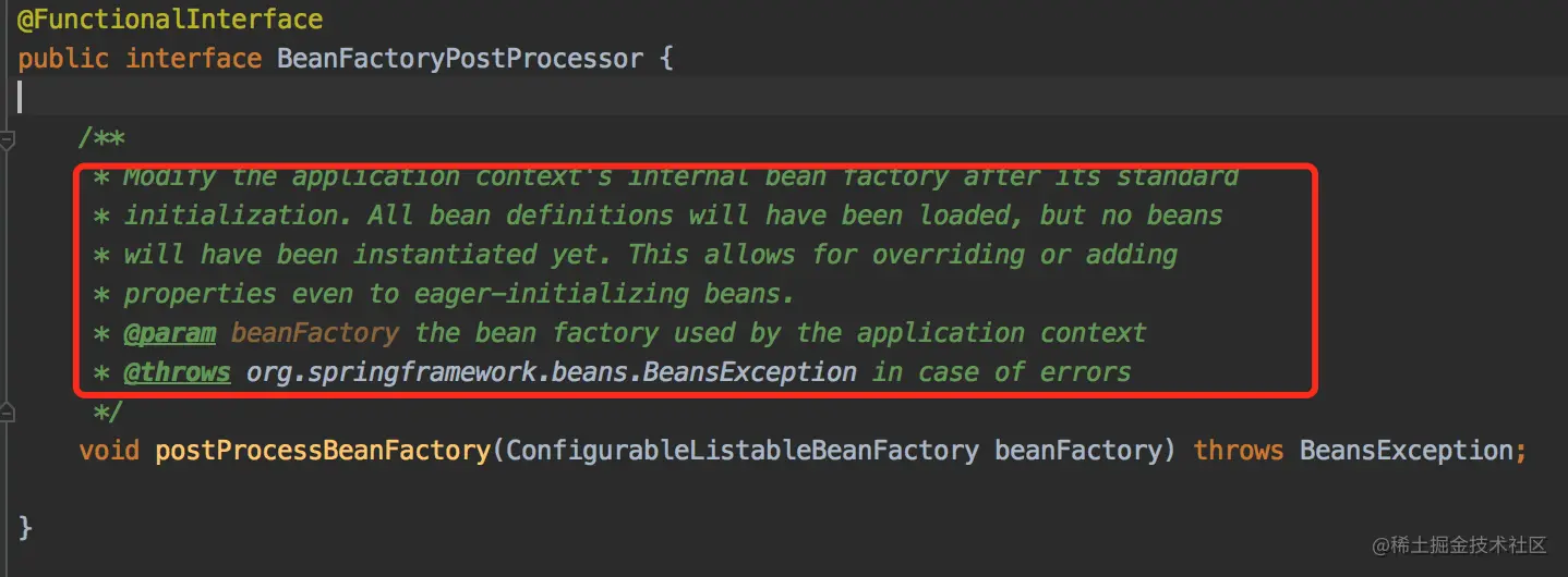 不过细心的朋友可能会发现,里面还多了一个postProcessBeanFactory方法,没有做任何实现。
