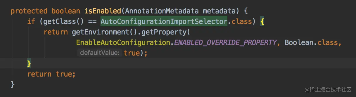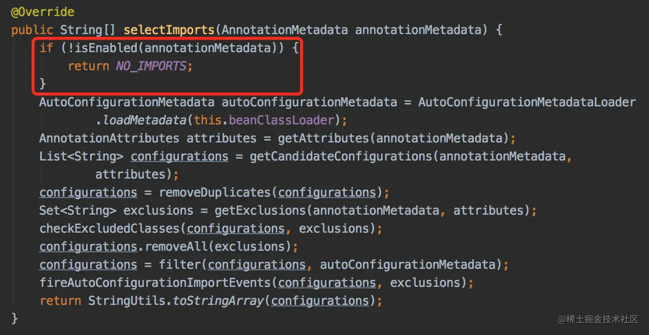 selectImports方法,该方法会根据某些注解去找所有需要创建bean的类名,然后返回这些类名。其中在查找这些类名之前,先调用isEnabled方法,判断是否需要继续查找。