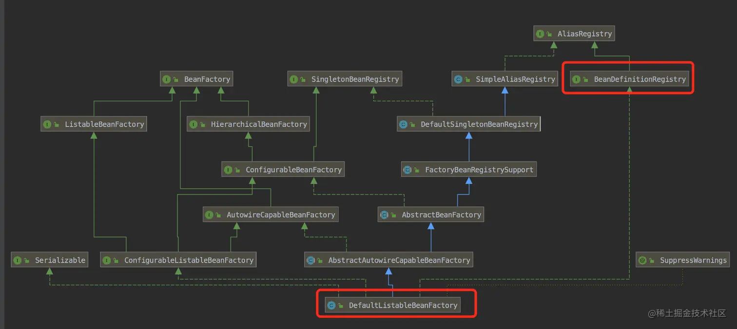 从下面这张图能够看出DefaultListableBeanFactory就实现了BeanDefinitionRegistry接口。