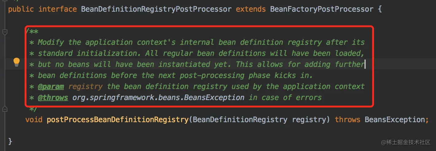 该接口的方法postProcessBeanDefinitionRegistry上有这样一段描述: