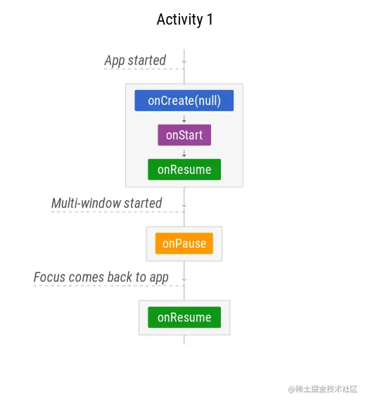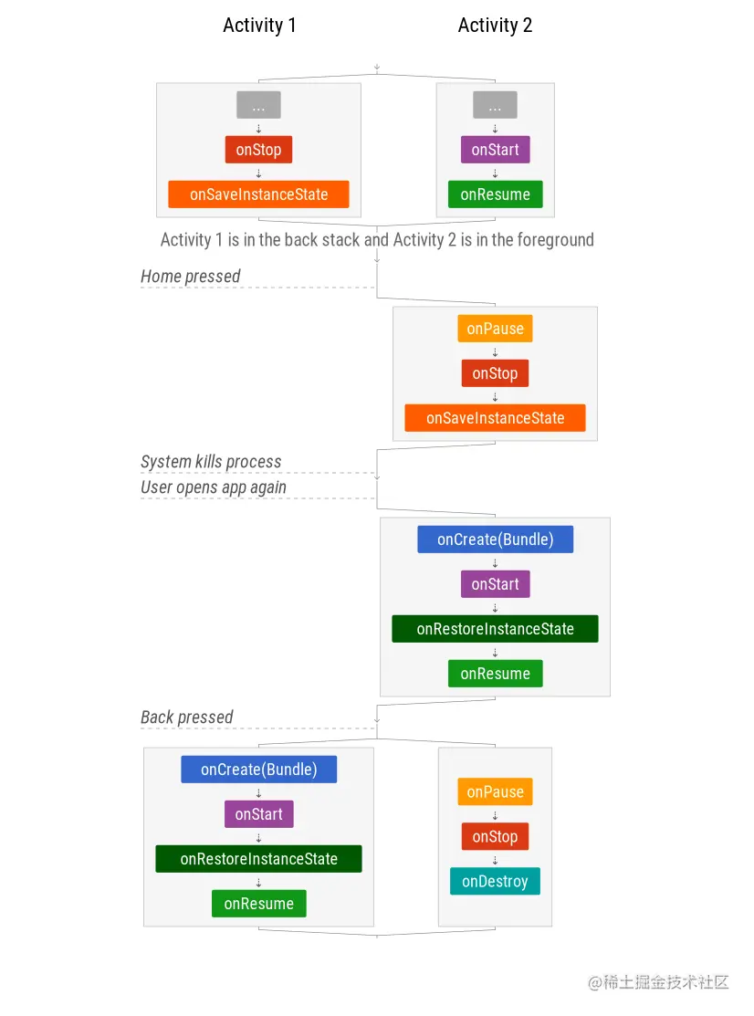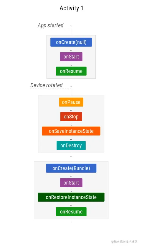 - onSaveInstanceState会被调用,但是onRestoreInstanceState不会。当activity2展示在前台时,如果发生了旋转屏幕,当activity1再次获得焦点时,它将会被销毁并且重建,这就是为什么activity1在失去焦点时为什么需要保存状态。