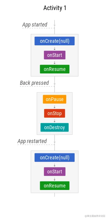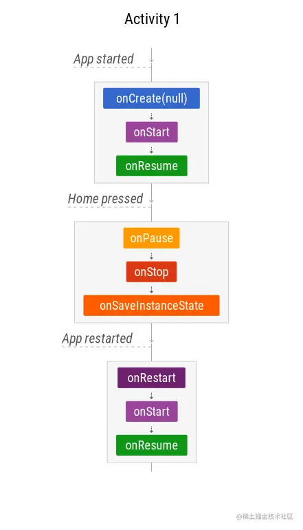 该场景演示了用户启动,销毁,重新进入Activity的生命周期变化。调用顺序如图: