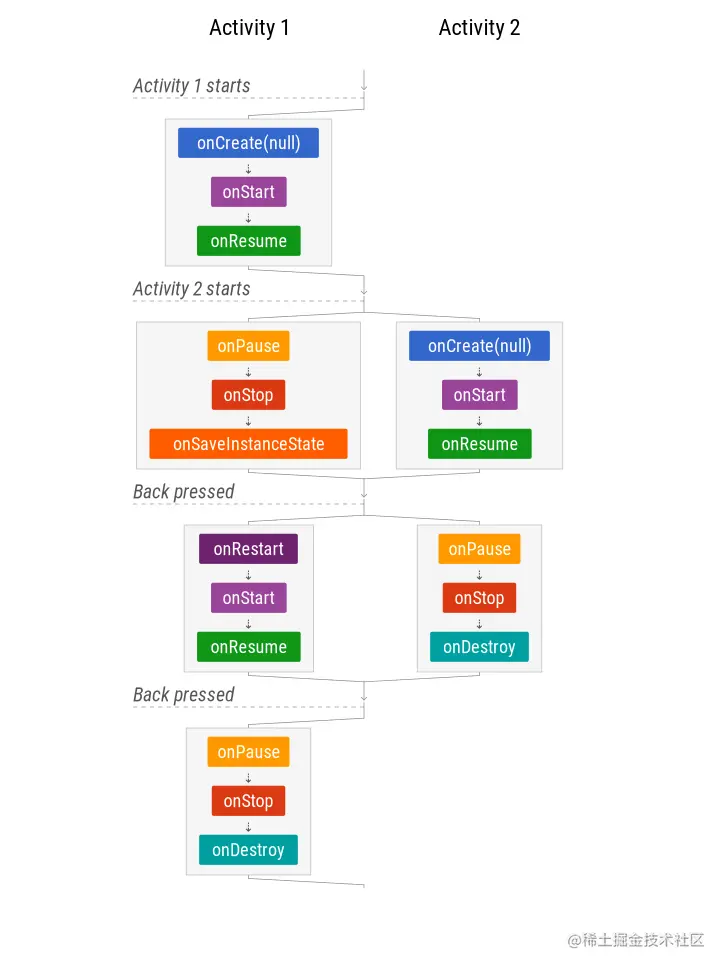 在该场景下,当新的activity启动时,activity1处于STOPPED状态下(但是没有被销毁),这与用户按Home键有点类似。当用户按返回按钮时,activity2被销毁掉。