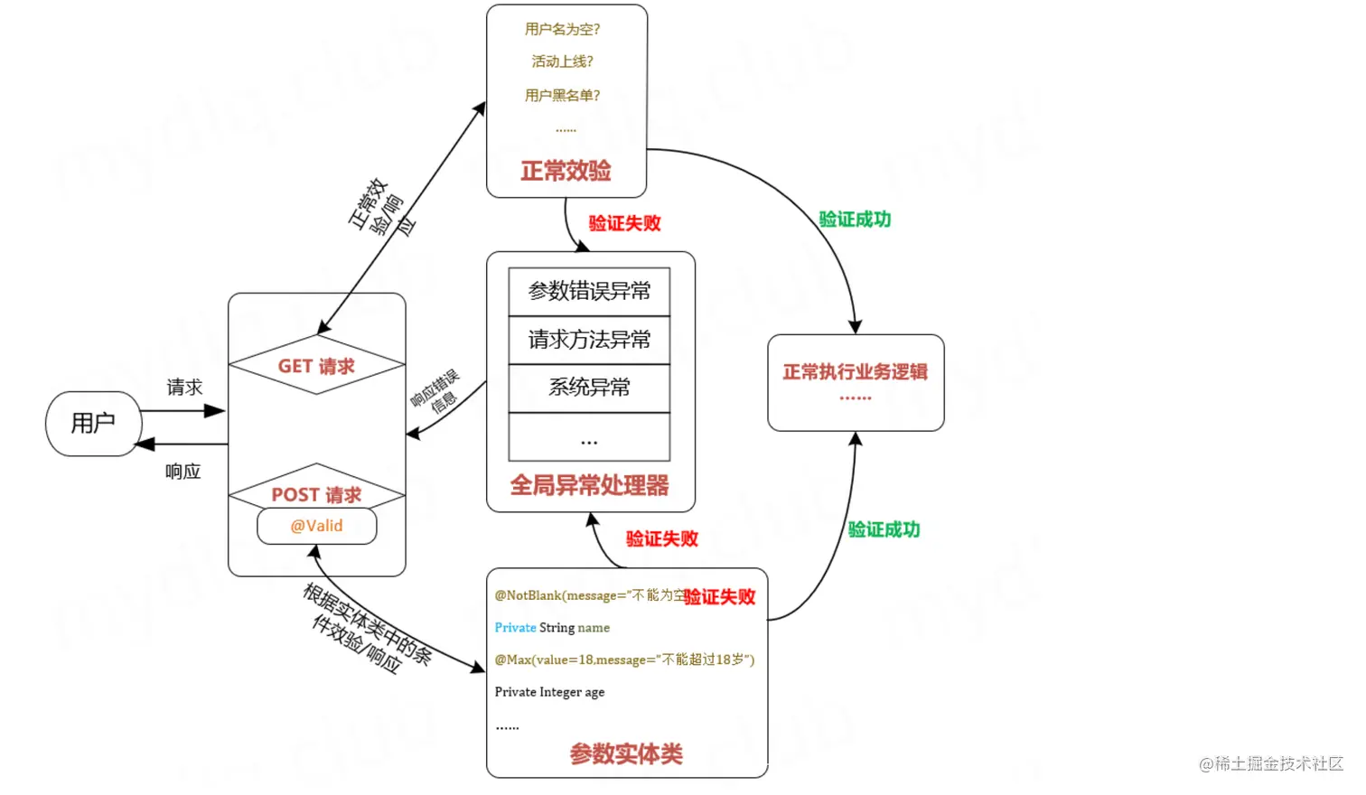 使用 Validation API 进行参数效验步骤整个过程如下图所示,用户访问接口,然后进行参数效验 ,如果效验通过,则进入业务逻辑,否则抛出异常,交由全局异常处理器进行处理