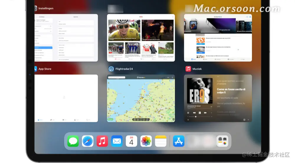 App Switcher在iPad上看起来不一样。应用程序并排显示在两行中,而不是像卡片一样叠放在一起。最近的应用程序在右上角,下一个应用程序在它的下方。然后,所有后续打开的应用程序都以 Z 手势分组。