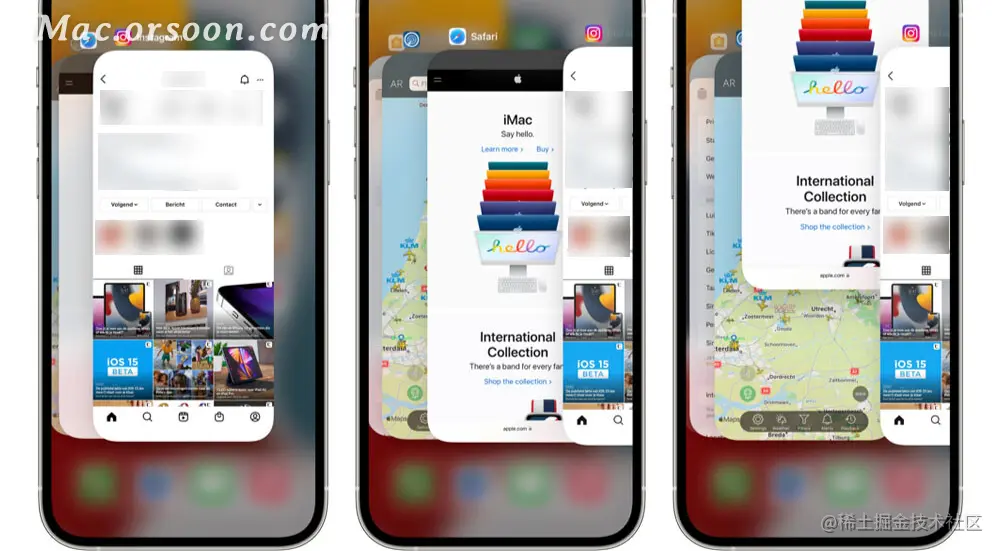 在 iPhone 和iPad上使用各种应用程序。为了更轻松地切换到最近使用的应用程序,您可以使用应用程序切换器(“应用程序切换器”)。这使您可以iPhone 和 iPad 上的应用程序切换器可让您在应用程序之间快速切换。将出现一个视图,显示正在运行的不同应用程序。您可以浏览它,打开或关闭应用程序。
