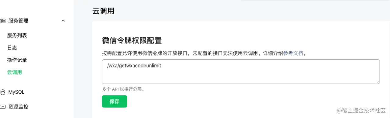 由于项目中需要使用到“云调用”获取小程序码的服务,所以这里安装一下微信云托管提供的OpenApi,这里一定要注意如果要使用“云调用”服务,微信令牌权限设置这里一定是要把要使用的接口先添加到白名单的。