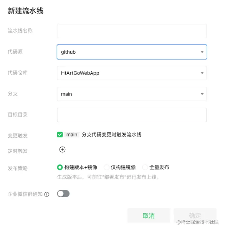 选择流水线发布的话第一步需要新建流水线,选择流水线发布的代码中必须要包含 container.config.json 文件,关于写法根据文档自己定义即可:developers.weixin.qq.com/miniprogram…