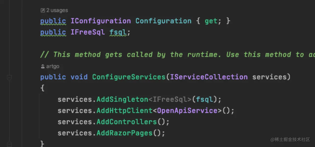 最后在 ConfigureServices 里面进行注入一下,注入方式为单例模式:services.AddSingleton(fsql)