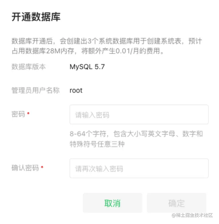 这次咱们也看看 mysql,微信云托管相比之前增加了 MySql 服务,开通也是非常方便。如下图所示简单几步就可以开通成功了并且支持自动暂停: