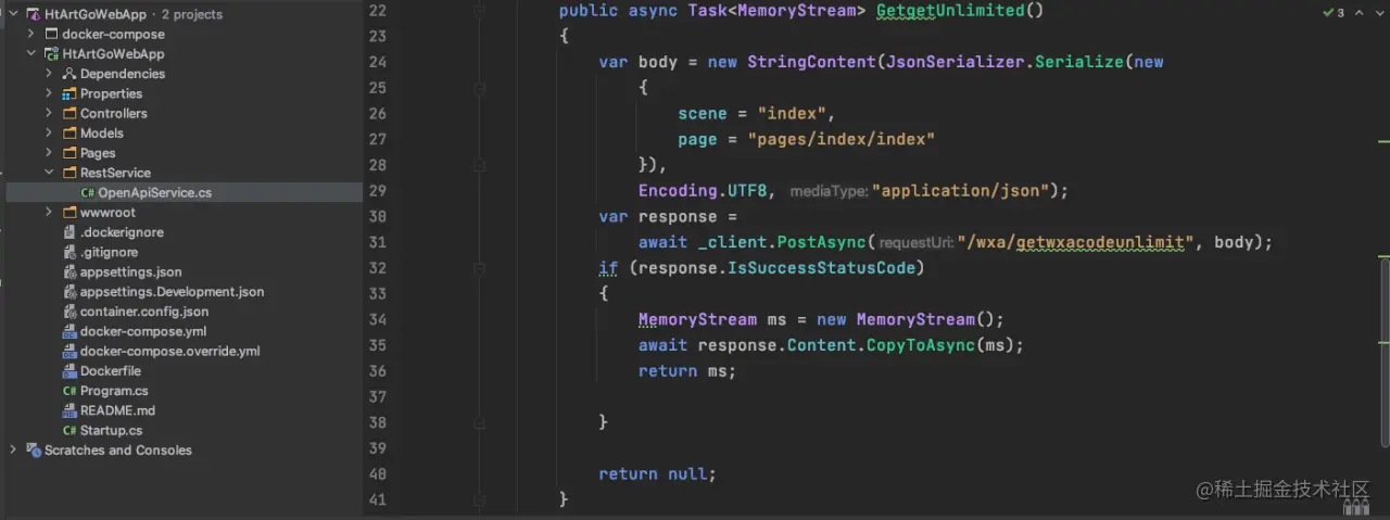 以上是数据库部分,接下来咱们使用微信云托管的 OpenApi 进行调用,关于 OpenApi 的部分放在 RestService 文件夹里面的 OpenApiService 类中