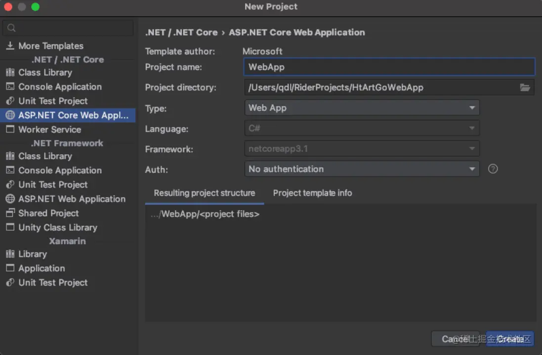 这里我创建一个.Net Core 项目,选择 WebApp 模版。