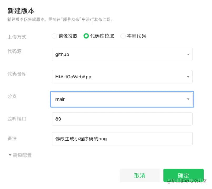 版本发布也是很方便的,定义好 Dockerfile 文件之后可以在腾讯云个人仓库构建配置那里配置从 GitHub 拉取或者本地构建好 docker 镜像后推送到腾讯云。我这里选择的是微信云托管代码拉取: