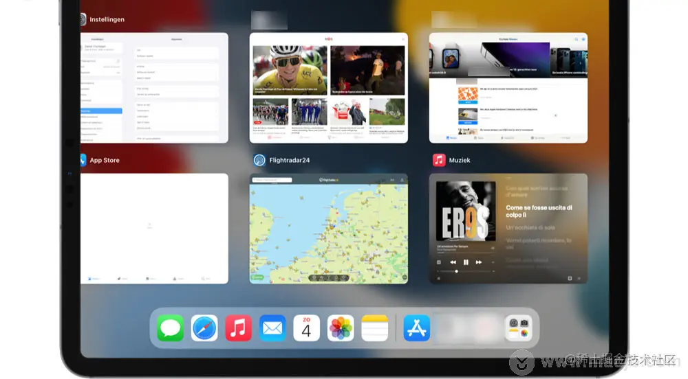 App Switcher在iPad上看起来不一样。应用程序并排显示在两行中,而不是像卡片一样叠放在一起。最近的应用程序在右上角,下一个应用程序在它的下方。然后,所有后续打开的应用程序都以 Z 手势分组。