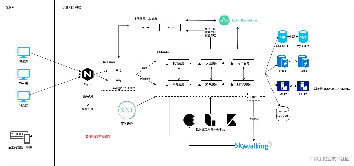 核心技术采用Spring Cloud Alibaba、SpringBoot、Mybatis、Seata、Sentinel、RabbitMQ、FastDFS/MinIO、SkyWalking等主要框架和中间件。 希望能努力打造一套从 JavaWeb基础框架 - 分布式微服务架构 - 持续集成 - 系统监测 的解决方案。本项目旨在实现基础能力,不涉及具体业务。
