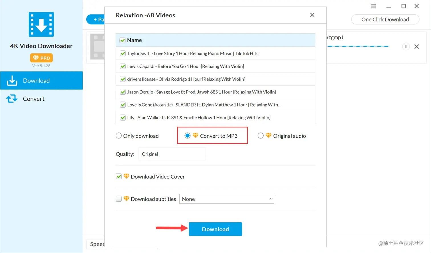 第三步:打开 4K Video Downloader 软件,点击粘贴链接,然后勾选弹窗里的“Convert to MP3”选项, 再点击里面的下载按钮。