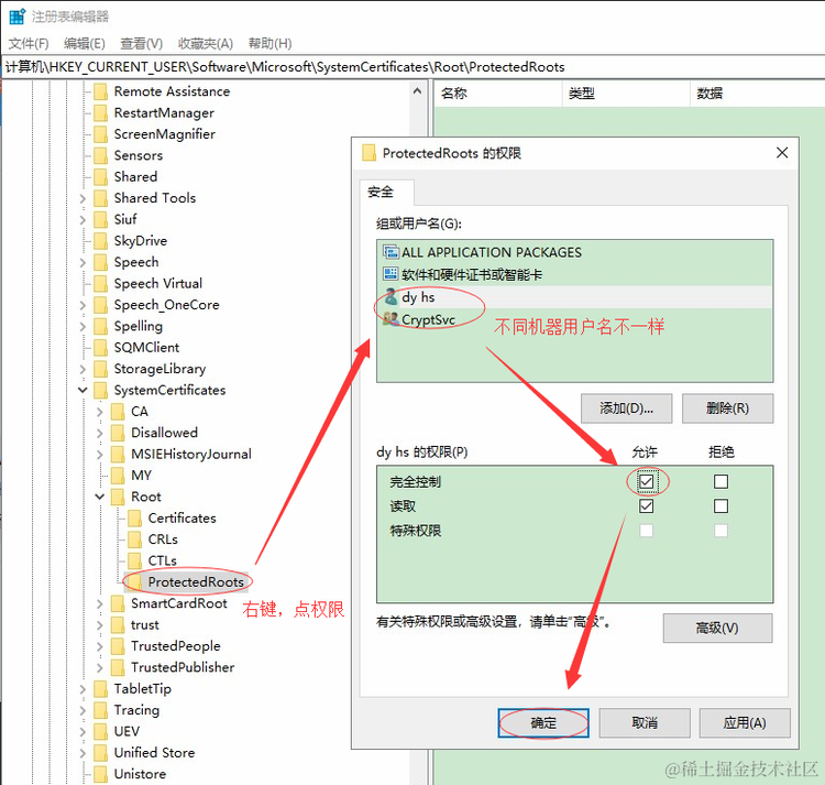 右键点权限,(如果有弹窗,点重新排序,不是每台电脑都会遇到),把所有用户名(下图4个)都设置成完全控制权限,点确定,右键ProtectedRoots,点删除,如下图,如果还不行,看步骤2
