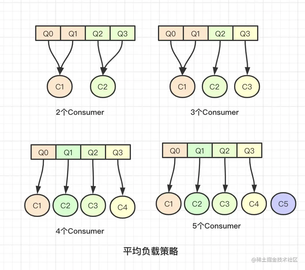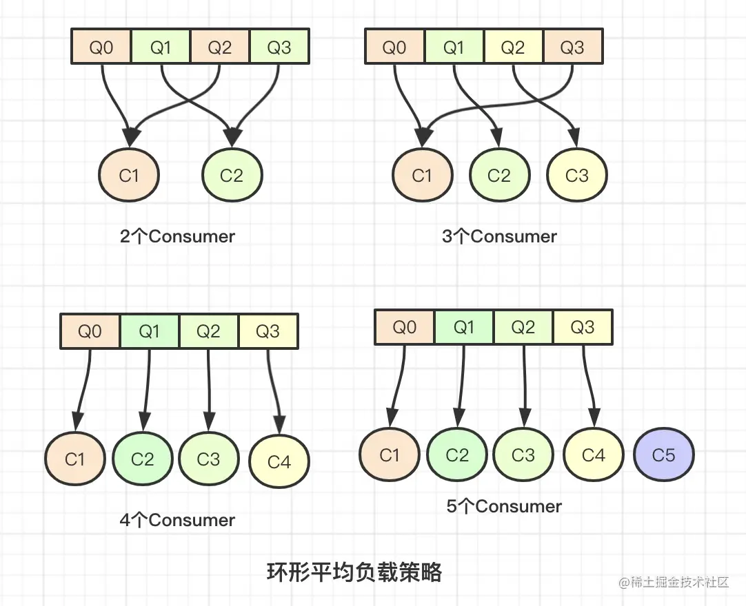 如果队列数量不是消费者的整数倍,跟上图3个Consumer和5个Consumer的情况一样,5个Comsumer的比较特殊,我们过会再讲,我们拿3个Consumer的情况来举例,4个消息队列,每个Consumer能分到1个,还剩下1个,弱肉强食嘛,剩下的当然给排在前面的大哥C1啦,最后分下来,C1分到2个队列,C2和C3只分到一个,分完数量以后,也是按照顺序来拿,C1拿到了Q0和Q1,然后C2就只能从Q2开始拿,C3只能拿剩下的Q3啦