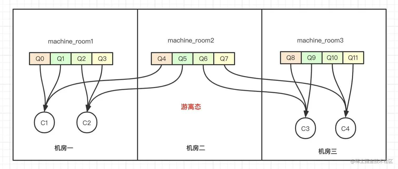 5. 最终该Consumer分到的MessageQueue会包含同机房分配到的和部分游离态分配的