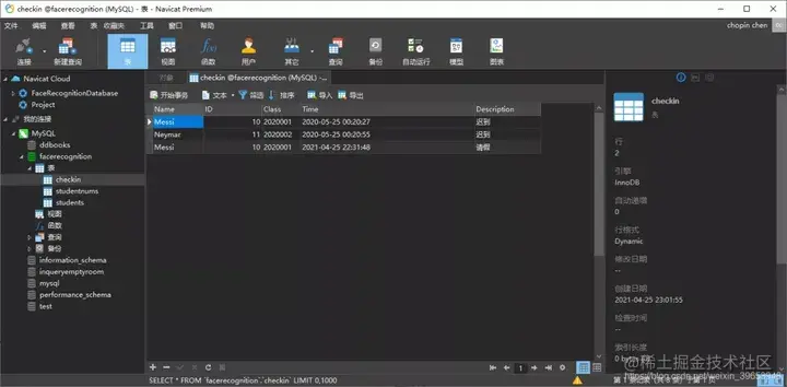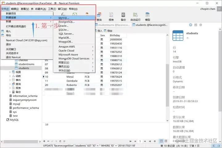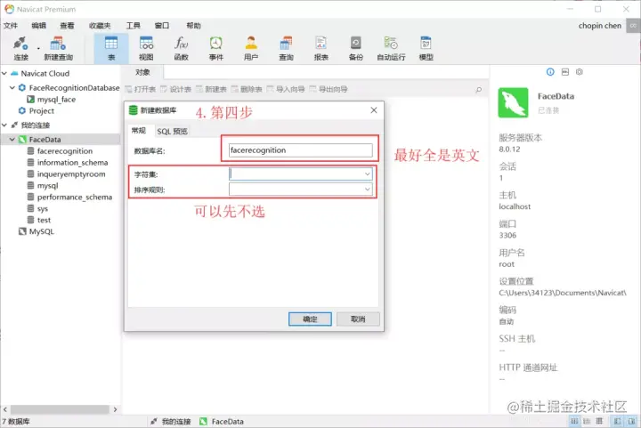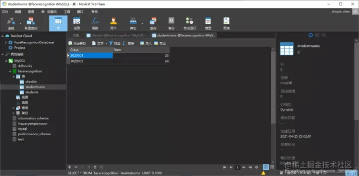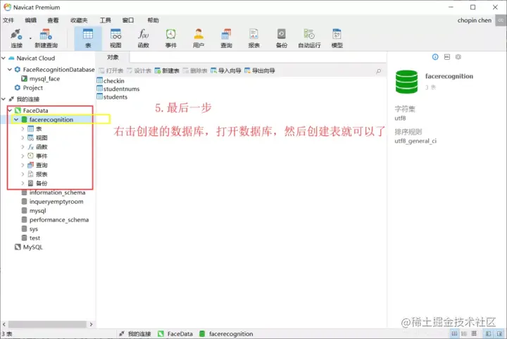 安装 msqlservice 然后修改 exacute.py文件中的数据库连接代码。比如 db = pymysql.connect("localhost", "root", "mysql105", "facerecognition")。这首先需要在 navicat中创建数据库。