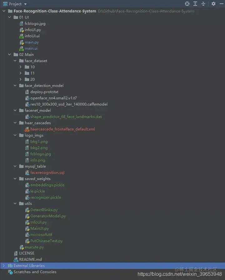 如果不是通过本系统的信息采集功能采集的人脸照片,请将采集的人脸照片放到 face_dataset/XX 路径下,其中XX是学号(唯一索引),如果是通过系统采集的,则会自动存放在该路径下,不需要修改。
