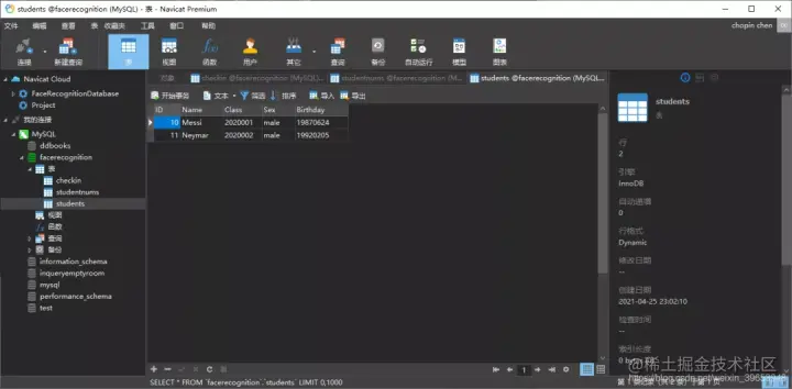 navicat创建数据库,打开数据库录入学生信息和班级信息;