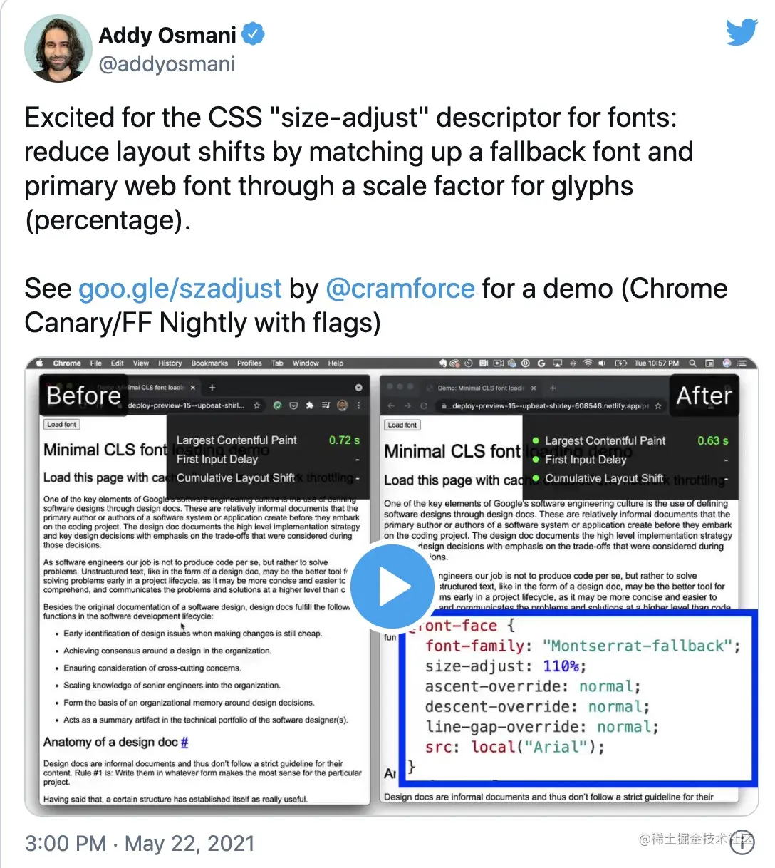 所以,目前貌似还没有完全可以使用,但看起来它会在不久的将来到来。 与此同时,试试 Chrome Canary 中的演示,看看它是否可以更接近于解决您的字体加载问题及其造成的 CLS 影响。