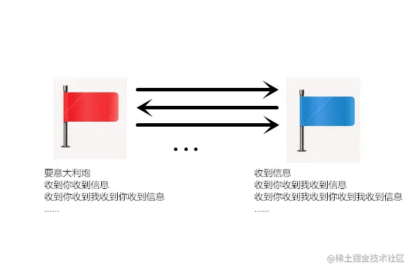 第一次听说这个问题居然是在TCP的课上,大致说的是有两个相距很远的军队要传递信息,红军派遣一个信使去跟蓝军说:“你他娘的把意大利炮拿出来!”。蓝军收到信息后又派了一个信使去红军说:“收到指令!”。然后红军又派一个信使去蓝军说:“知道你收到指令了!”。然后蓝军又派一个信使去红军说:“知道你知道我收到指令了!”。然后红军又派一个信使去蓝军说:“知道你知道我知道你收到指令了!”……然后就没完没了了。