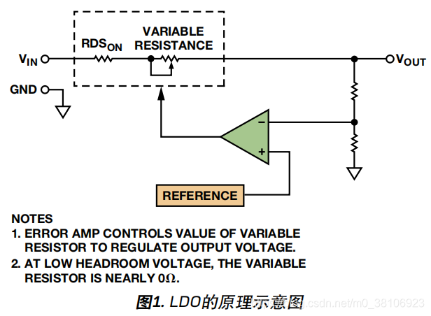 图1所示为LDO的原理示意图。在压差模式下,可变电阻接近于零。LDO无法调节输出电压,因此输入电压和负载调整率、精度、PSRR和噪声等其他参数都没有意义。