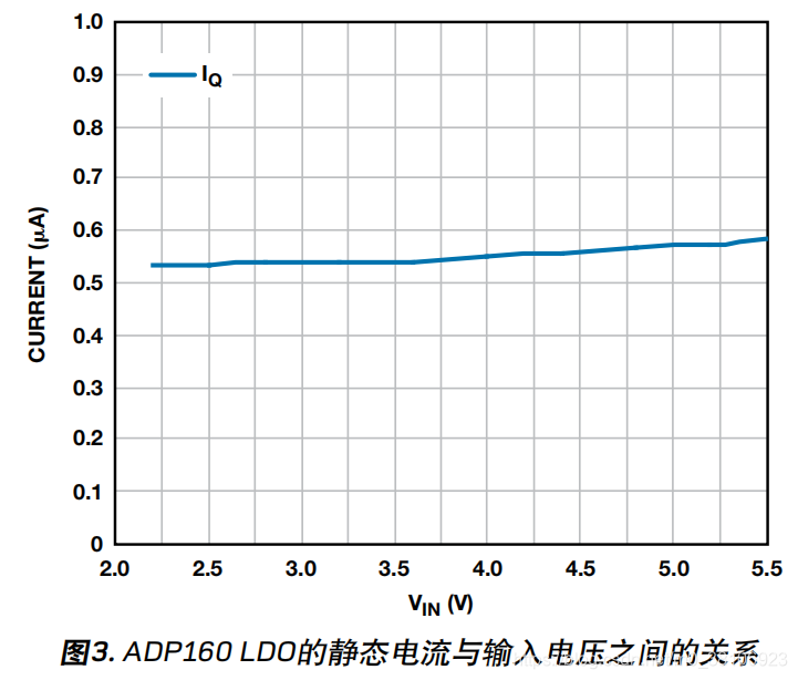 当输入电压在2V 和5.5V之间变化时,ADP160 LDO 的静态电流几乎恒定不变,如图3 所示。