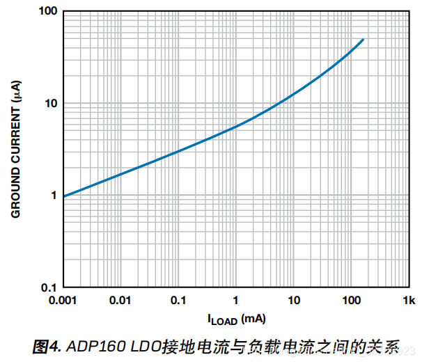 图4显示了ADP160 LDO的接地电流变化与负载电流之间的关系。