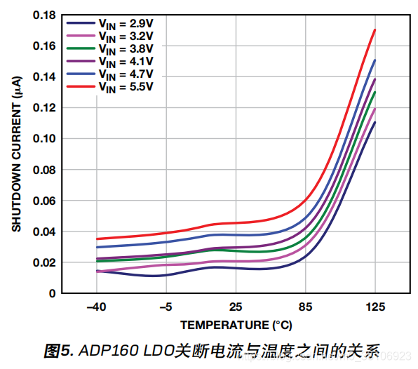 关断电流是指输出禁用时LDO 消耗的输入电流。参考电路和误差放大器在关断模式下都不上电。较高的漏电流会导致关断电流随温度升高而增加,如图5 所示。