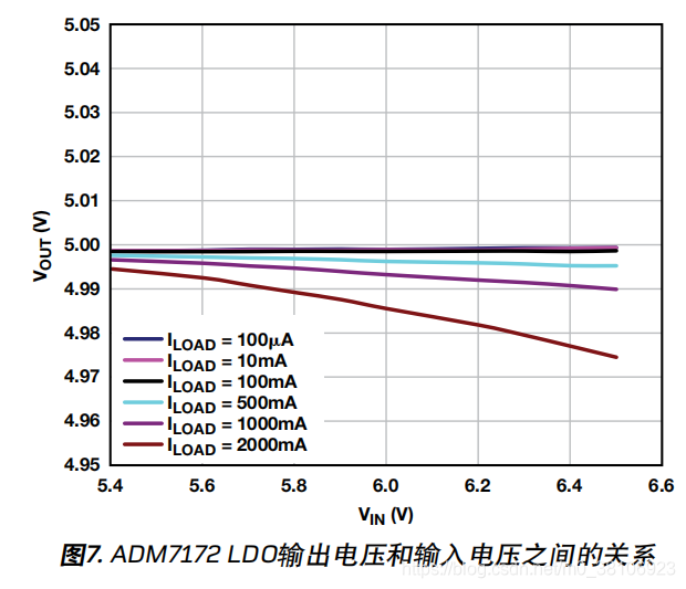图7 显示了不同负载电流条件下ADM7172的输出电压与输入电压之间的关系图。输入电压调整率随着负载电流增加而变差,原因是LDO 的总环路增益不断降低。