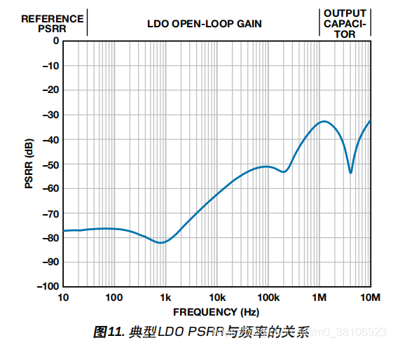 LDO 的控制环路往往是确定电源抑制性能的主要因素。同时大容量、低ESR 的电容也对电源抑制性能非常有用,特别是在频率超过控制环路增益带宽的情况下。